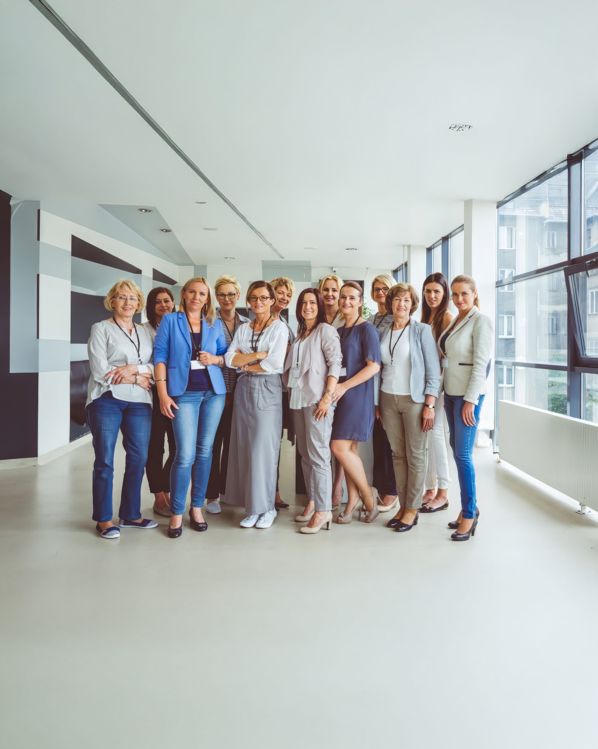 Portrait of large group of happy woman during conference, smiling at the camera.